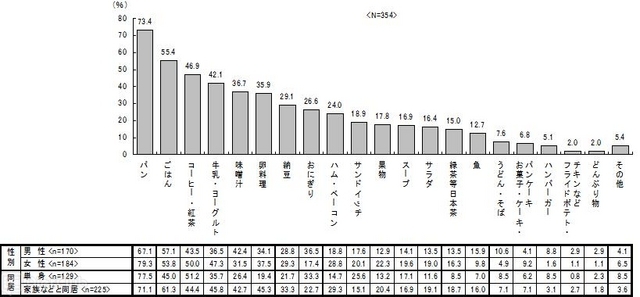 朝食を「毎日食べる若者」は半数以下(46.5%)で、「食べない」も約1割(11.0%)に達している。平均は週に4.9回で6年前の4.7回より若干増加した。メニューは1位が「パン」(73.4%)、2位が「ごはん」(55.4%)だが、朝「ごはん」を食べる人が増えている(前回44.9%)。