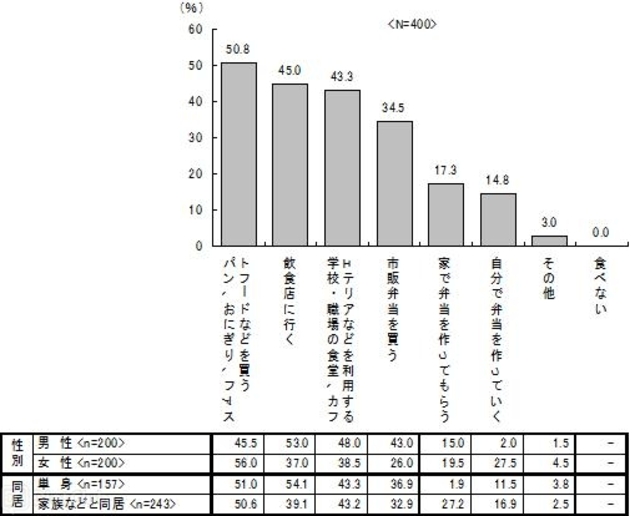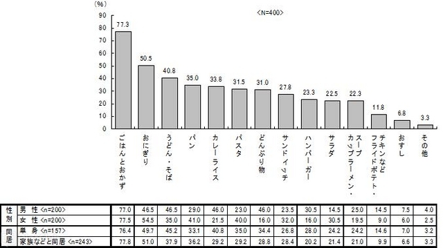 昼食は「パン、おにぎり、ファストフードなどを買う」(50.8%)が過半数でトップとなり、2位は「飲食店に行く」(45.0%)だった。メニューは「ごはんとおかず」(77.3%)が8割近くで、「おにぎり」(前回39.1%→今回50.5%)、「ごはんとおかず」(前回69.3%→今回77.3%)が増加している。