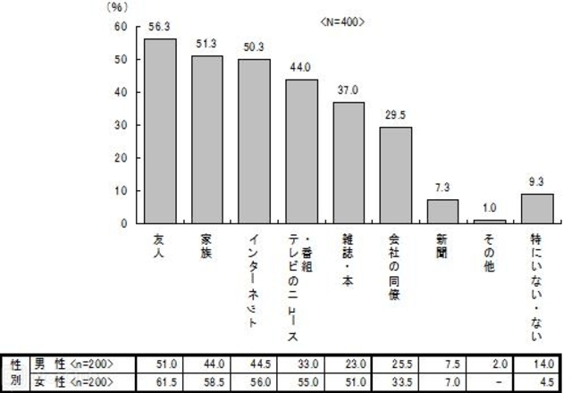 料理や食べ物についての情報源では、「友人」(56.3%)や「家族」(51.3%)と「インターネット」(50.3%)がいずれも5割を超えており、前回調査と比較すると「インターネット」(前回26.5%→今回50.3%)がほぼ倍増しているが、「新聞」(前回17.0%→今回7.3%)は半減した。