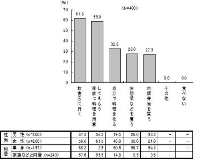 夕食では「飲食店に行く」(61.8%)と「家族に料理を用意してもらう」(59.0%)が共に多数派だが、《単身》は7割近く(68.2%)が「飲食店に行く」なのに対し、《家族などと同居》では「家族に料理を用意してもらう」が9割以上(95.5%)を占めている。自炊する(調理を手伝う)人は半数弱(46.3%)だが、頻度は週に平均「1.5回」となっている。