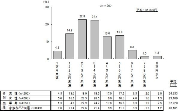 食費は月平均で「31,876円」、1日あたり「1,063円」となっている。6年前(月平均36,658円、1日あたり1,222円)に比べると、月4,782円、1日あたり159円下がっている。《男性》(1日あたり1,155円)の方が《女性》(1日あたり970円)より185円高く、《家族などと同居》(1日あたり937円)よりも《単身》(1日あたり1,257円)の方が320円高いなど、いずれも順番は妥当と思われるものの、差額が大きい点に注目したい。