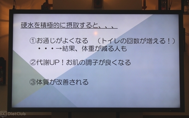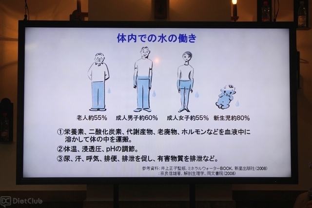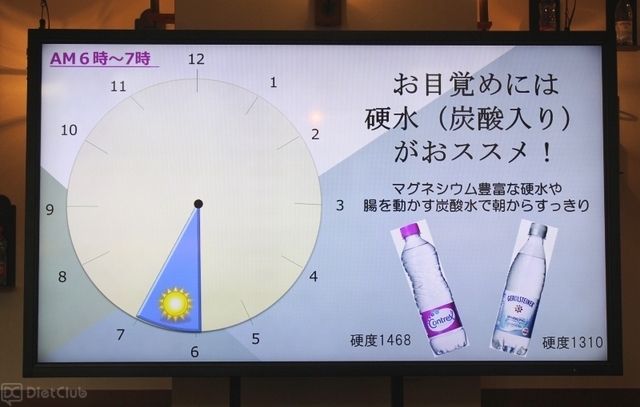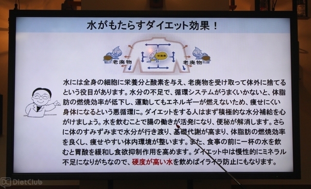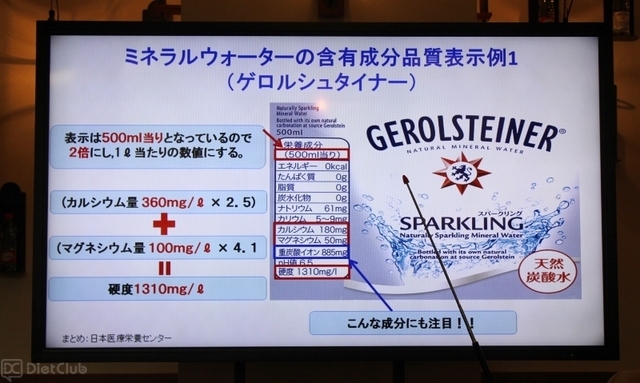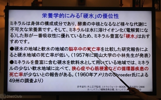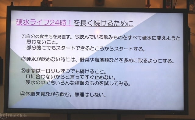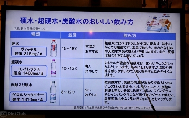 その上で、「ミネラルウォーターの含有成分品質表示」の注目ポイントや、「硬水・超硬水・炭酸水のおいしい飲み方」のほか、「栄養学的にみる“硬水”の優位性」などを話したあと、「水とダイエット」に関する話題にも触れた。