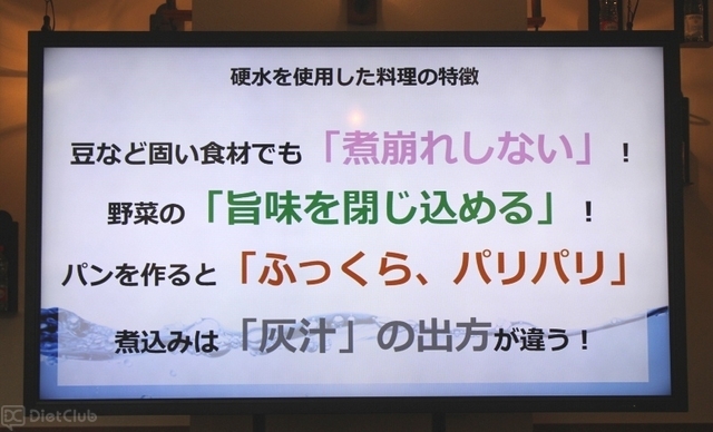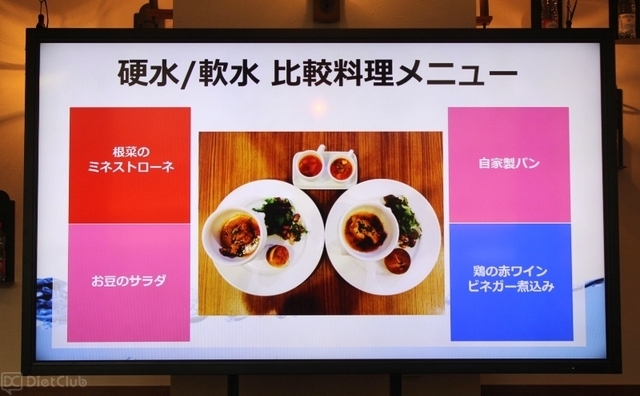 セミナー参加者たちは、食材、調理法が同じで、水だけを変えた2種類のメニューを試食。硬水で茹でた豆は煮崩れしておらず、野菜スープは旨味が濃厚だった。また、硬水で作ったドリンクもあり、水の硬度の違いで、食べ物や飲み物の味や仕上がりに違いが出ることを体験することができた。