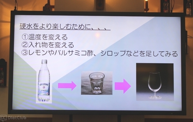 また、山中氏は「自分の食生活を見直し、硬水を飲めるタイミングからスタートしてみましょう。硬水は温度で味が変わるので、飲みやすい味を保つためにも、ペットボトルではなく、低温状態を維持しやすい脚があるグラスに注いで飲むのがオススメです。また、硬水にレモンやバルサミコ酢を入れると飲みやすくなります。ですが、あくまで自分の体調を考慮しながら飲みましょう。無理をしないことが大切です」といい、硬水を長く飲み続けるコツを紹介していた。