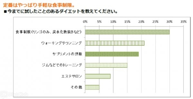 どんなダイエットを試したことがあるか尋ねたところ、最も多かったのは「食事制限」で、続いてウォーキングやランニングという手軽な運動となり、両方行うと答えた人も多かった。中には、「ロングブレスダイエット」「レコーディングダイエット」「カーヴィーダンス」など様々なダイエット法を試したという意見や、ダイエット食学習会に参加したという人もいた。