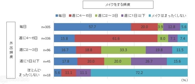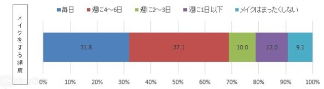 まず、普段の外出頻度とメイクをする頻度を聞いた。今回のアンケートでは、全体の約5割が現在仕事をしている女性だが、「毎日」または「週に4~6日」外出していると答えた人で8割を占めている。メイクをする頻度については、週4~6日以上の女性が68.9%と7割弱で、9.1%が「メイクはまったくしない」と回答した。