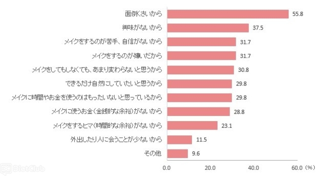 メイクをすることがほとんどなく、「数ヶ月に1日程度」または「まったくしない」と答えた女性に、その理由を聞いたところ、最も多かったのは「面倒くさいから」(55.8%)。「メイクに時間やお金を使うのはもったいないと思っているから」(29.8%)、「メイクをするヒマ(時間的な余裕)がないから」(23.1%)なども含めると、家事や仕事で生活が忙しく、メイクにかける時間がないことや面倒に感じてしまう背景もうかがえた。また、2番目に多かったのは「興味がないから」(37.5%)で、「メイクをするのが嫌いだから」(31.7%)も3割と、そもそもメイクをすることに対して関心がない、嫌いだからメイクをしないという女性も少なくない。「その他」(9.6%)の具体的な内容では、「肌荒れする」「肌によくないから、成分が合わないから」「どうせ崩れてしまうから」「メイクをすると目が痛くなる」「会社でメイクが禁止されているから」といった回答があった。