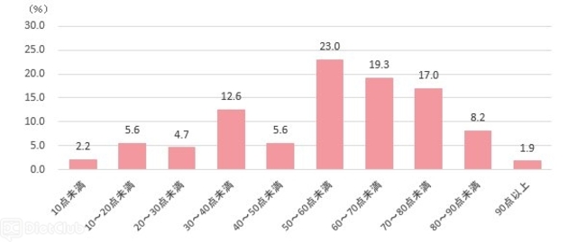 月に1日程度以上メイクをしている女性に、自分自身のメイクの腕前を100点満点で評価してもらったところ、全体の平均は「51点」と、やや厳しい評価となっている。最も回答が多かったのは50点台で、次いで60点台、70点台。50点~79点で全体の6割を占めた。90点以上をつけた女性はわずか1.8%で、自分のメイク力に自信を持っている女性はとても少ないようだ。