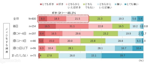 普段メイクをする人、しない人も含めて、メイクをすること自体が好きかどうかを聞いたところ、「とても好き」「好き」「どちらかといえば好き」を合わせた「メイクが好き」な女性は48.1%で、全体の5割に満たないことが明らかになった。「どちらでもない」は21.3%で、「どちらかといえば嫌い」「嫌い」「とても嫌い」の合計は30.8%だった。