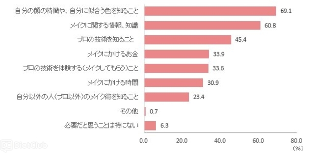 続いて、メイクがもっと上手になるためには、どのようなことが必要だと思うかを聞いたところ、最も多かったのは「自分の顔の特徴や、自分に似合う色を知ること」(69.1%)で全体の7割に上った。次に「メイクに関する情報、知識」(60.8%)、「プロの技術を知ること」(45.4%)、「メイクにかけるお金」(33.9%)、「プロの技術を体験する(メイクをしてもらうこと)」(33.6%)と続いている。「必要だと思うことは特にない」と答えた人は6.3%となっている。