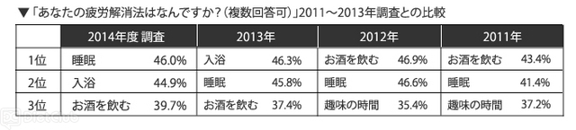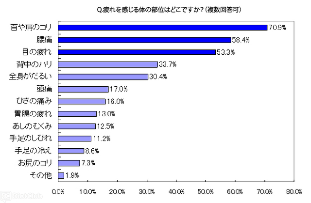 「疲れを感じる体の部位はどこですか?」という設問に対して、1位に「首や肩のコリ」(70.9%)、2位に「腰痛」(58.4%)、3位に「目の疲れ」(53.3%)という結果になった。これは2011年に行った調査から、この3項目の順位に変化はなく、近年の慢性的な疲れが解決できていないことがわかる。