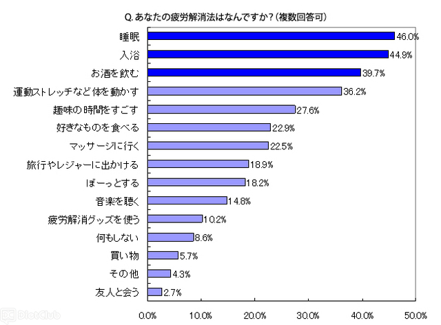 「あなたの疲労解消法はなんですか?」と聞いたところ、1位「睡眠」(46.0%)、2位「入浴」(44.9%)、3位「お酒を飲む」(39.7%)となった。「お酒を飲むこと」の回答は、母への同じ調査では上位にランクインしておらず、父の特徴的な行動であることがうかがえる。