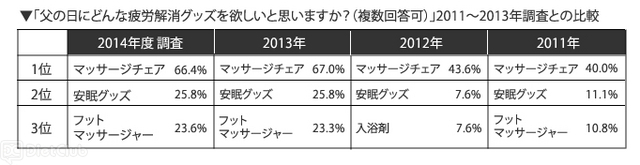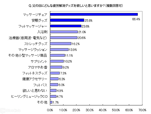「父の日にどんな疲労解消グッズを欲しいと思いますか?」という設問には、「マッサージチェア」(66.4%)が1位となった。また、上位ではないものの、女性的なイメージをもたれやすい「アロマやお香」と答えた人が約10%おり、「フィットネスグッズ」(7.3%)よりも高い結果となっている。