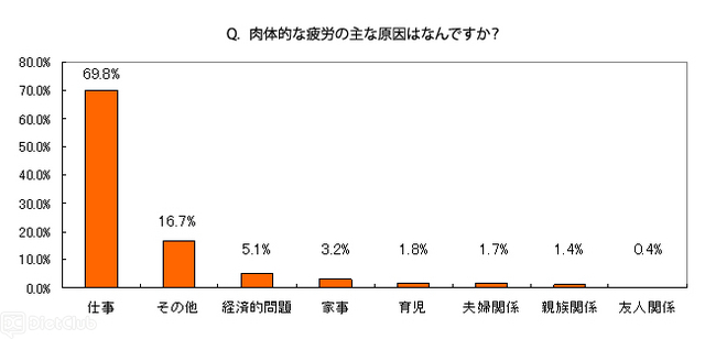 いつも疲れを感じていると回答した父は、88.9%だった。その疲れが肉体的なものか精神的なものかについて尋ねると、肉体的疲労を感じているのは56.0%で精神的疲労の44.0%を上回った。更に、疲れの原因としては7割が「仕事」と回答し、仕事が父たちの疲れを大きく誘発していることがわかった。