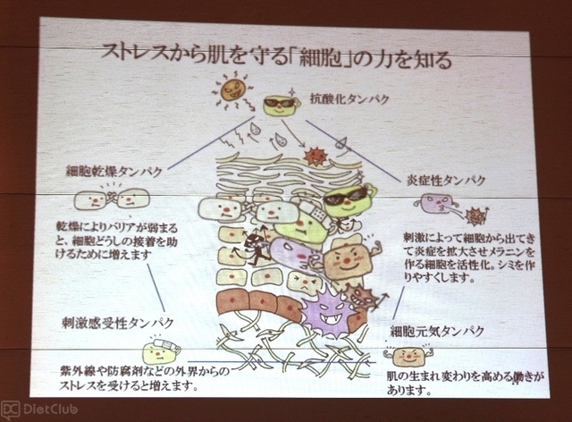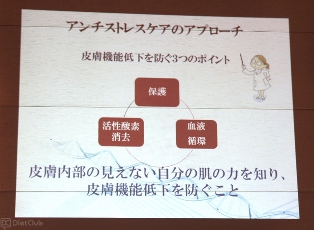 続いて、松熊氏は、紫外線や洗いすぎなどの外的ストレスの影響をどのくらい受けているのかの指標となる5つのタンパク「細胞乾燥タンパク」「刺激感受性タンパク」「炎症性タンパク」「抗酸化タンパク」「細胞元気タンパク」について解説。そのうえで松熊氏は、「皮膚機能低下を防ぐポイントは、『保護』・『活性酸素除去』・『血液循環』であり、皮膚内部の見えない自分の肌の力を知り、皮膚機能低下を防ぐことが大切です」と話していた。