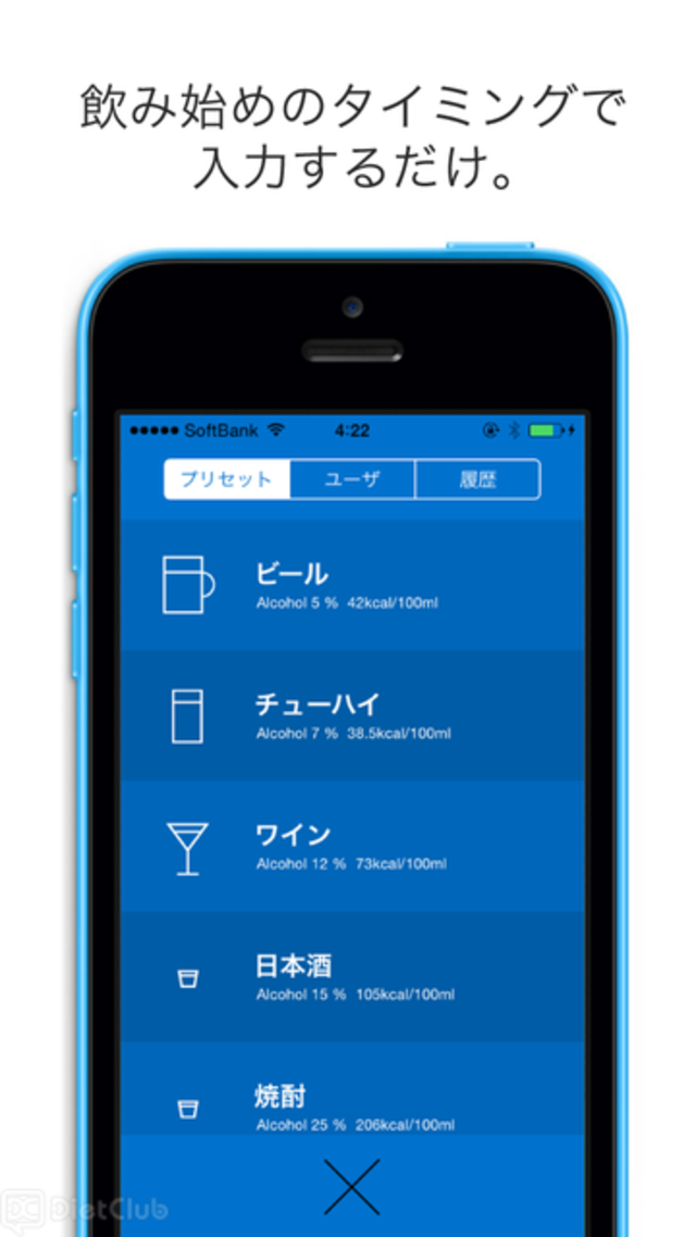 同アプリは、はじめに利用者の性別と体重を設定したら、あとは酒を飲む度にその種類と量(グラス等)を選択し追加すると、摂取したアルコール量と体内濃度、酔いが覚めるまでの時間、摂取カロリー計算、二日酔い判定をリアルタイムに計算・表示する。