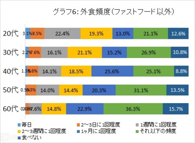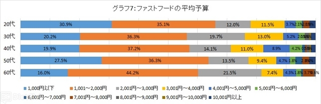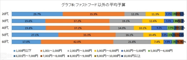 今回の調査で、外食についてその頻度と平均予算について年代別で聞いたところ、ファストフードもそれ以外についても、年代が若くなるにつれて頻度が高くなる傾向にあることがわかった。また、平均予算については、どの年代についてもファストフードもそれ以外も、2,000円未満と回答した人が多いという結果になった。