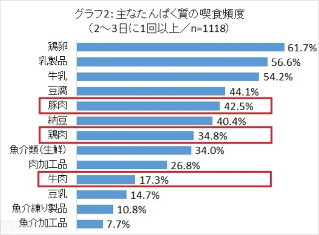 たんぱく質を含む、主な食品の嗜好度について聞いたところ、「好き」(「とても好き」+「好き」)と回答した人が多かったのは、「豚肉」(79.7%)、「牛肉」(76.7%)、「鶏肉」(76.1%)と、肉類が上位を占めた。しかし、喫食頻度について聞くと、「2~3日に1回以上食べる」(「毎日」+「2~3日に1回」)と回答した人が多かったのは、「鶏卵」(61.7%)、「乳製品」(56.6%)、「豆腐」(44.1%)等が上位を占め、肉類については「豚肉」が一番高く42.5%だったが「牛肉」は嗜好度が高いにも関わらず17.3%と、喫食頻度は低いことが明らかになった。