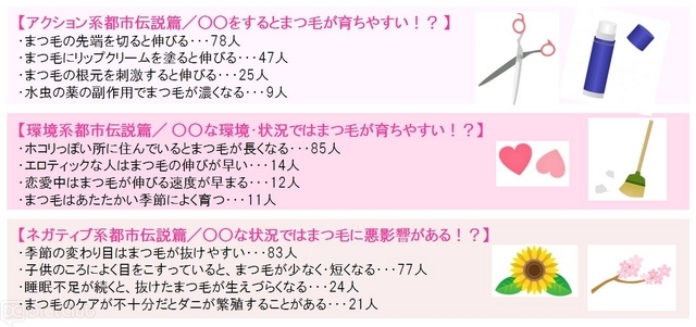 特に多かったのは、「ホコリっぽい所に住んでいるとまつ毛が長くなる(85人)」「季節の変わり目はまつ毛が抜けやすい(83人)」「まつ毛の先端を切ると伸びる(78人)」「子どものころによく目をこすっていると、まつ毛が少なく・短くなる(77人)」「まつ毛にリップクリームを塗ると伸びる(47人)」「まつ毛のケアが不十分だとダニが繁殖することがある(21人)」などだった。