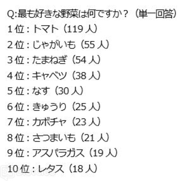 また、同調査で「最も好きな野菜」について聞いたところ、全世代で1位となったのは「トマト(119人)」で、2位は「じゃがいも(55人)」、3位は「たまねぎ(54人)」だった。