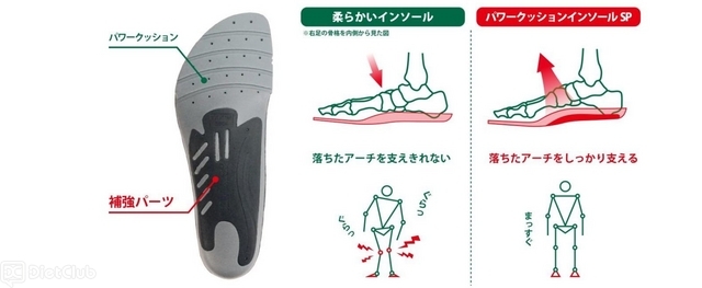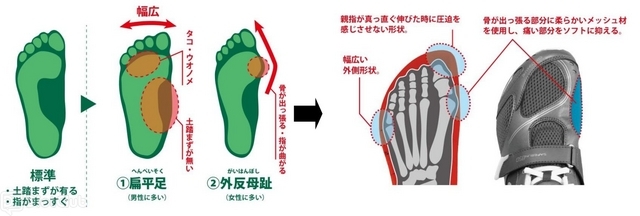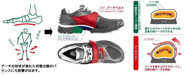 同商品は、筋力の低下や体重の増加等で低下した足裏のアーチを支える機能を備えたほかに、アーチが低下した人に多くみられる症状である外反母趾や扁平足に対応する新設計とし、圧迫感を抑えて気軽にランニングが楽しめるように作られている。このほかにも、つま先を上げやすくする設計や、正しい着地に導く機構を採用するなど、膝への負担を緩和する機能を備えている。