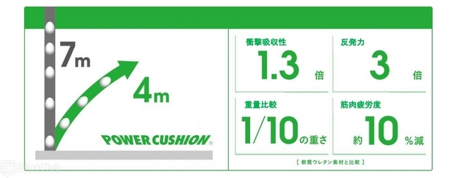 7mの高さから落とした卵が割れずに4m以上跳ね返る、同社独自の衝撃吸収材パワークッションをソールのかかと部と踏みつけ部インソールに配置し、衝撃を吸収して次の一歩をアシストする。価格は13,000円+税。