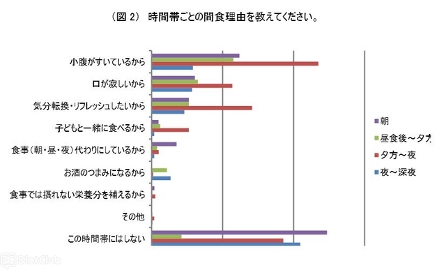 また、同調査で、1日以上間食をする人を対象に「時間帯ごとの間食理由」を聞くと、89.4%の人が「昼~夕方」と回答。間食理由のトップは「小腹がすいているから」で、「口が寂しいから」「気分転換・リフレッシュしたいから」などの理由も多かった。
