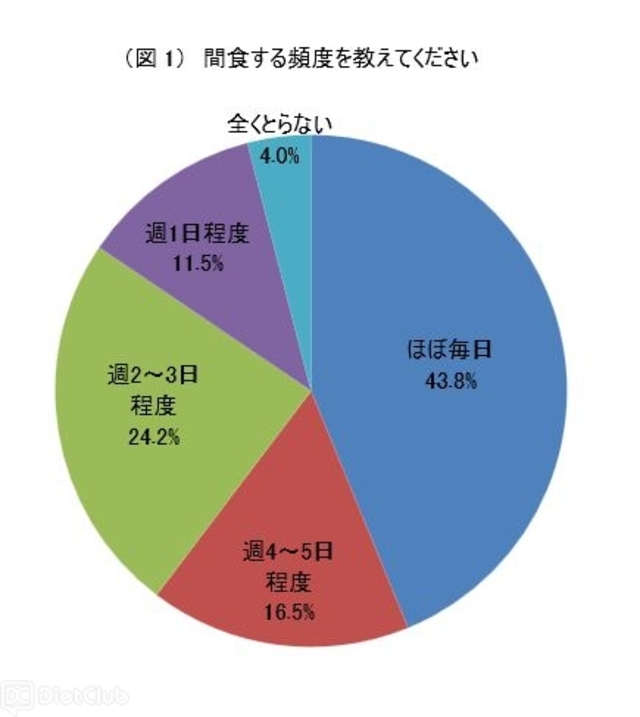 去る8月1日から5日の間、20代~50代の女性824名(専業主婦412名、オフィスワーカー412名)を対象に、カルビーが実施した「間食に関する意識調査」によると、「週に1日以上」間食している女性の累計が96%で、「ほぼ毎日」と答えた人が43.8%いたという。