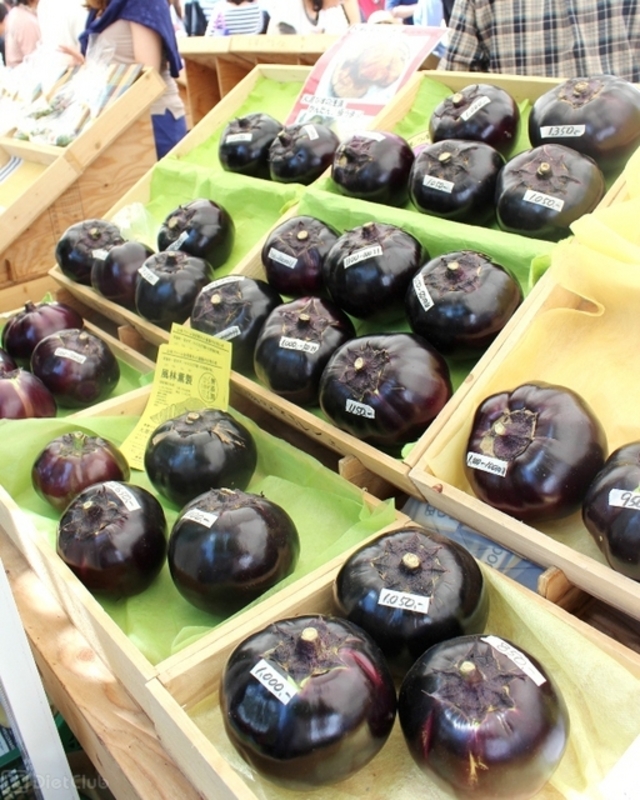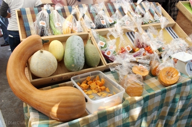 マルシェの会場(月島第二児童公園)には、数多くのテントが設営されており、約100店舗が出店。スーパーなどではほとんど見かけない、丸くて大きな肉厚のナスや、生でも美味しく食べられる巨大サイズのズッキーニなど、多種類の野菜や果物が販売されていた。