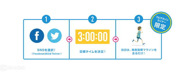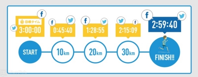 同サービスは、大会前日までの事前登録(無料)が必要。SNSを選択し、目標タイムを設定すると、大会当日は、大会公式タイム計測タグをつけて走るだけで、湘南国際マラソンをリアルタイムにSNSに記録する。走行タイムの自動投稿は、スタート、10km、20km、30km、フィニッシュ地点の計5か所となっている。