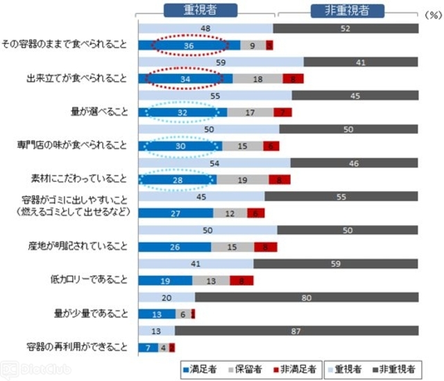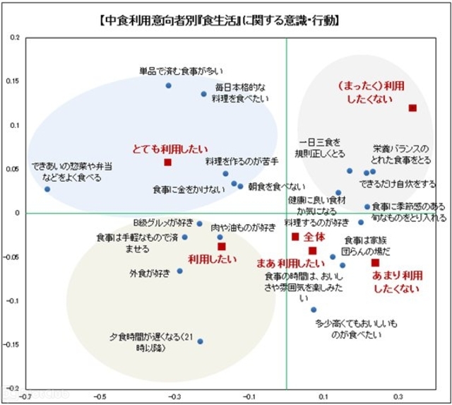 「中食」の商品利用意向者の重視度・満足度、割合が高かったものとして、「量が選べること」「専門店の味が食べられること」「素材にこだわっていること」は、5割以上の人が重視し、3割近くの人が満足していることがわかった。また、「中食」を「利用したい」と回答した人は「食事は手軽なもので済ませる」「肉や油ものが好き」など、対して「(まったく)利用したくない」の回答者は「栄養バランスのとれた食事をとる」「一日三食を規則正しくとる」などの“健康面”との関連が見られた。