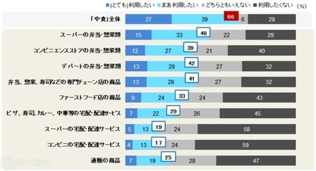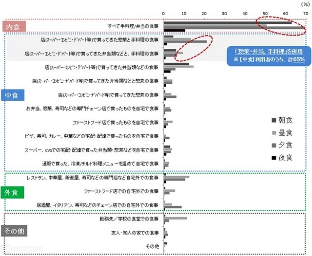 調査の結果、「内食」(すべて手料理/弁当の食事)の利用率(夕食69%、朝食63%、昼食51%)が最も高く、次いで「店で買ってきた惣菜と手料理の食事」(夕食21%)の夕食で惣菜をおかずの一品として利用するという項目が高く、そのほか「店で買ってきた弁当類などの食事」(昼食15%)、「店で買ってきた惣菜と手料理の食事」(昼食13%)などの「中食」が続いた。
