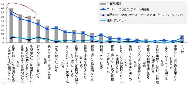 「中食」利用者の利用理由を見ると「食事を作るのが面倒なため/後片付けが面倒なため」(40%)、「食事を作っている時間がないため」(33%)、「手間隙かかる普段作れないものが手軽にとれるから」(31%)など、“簡便性”が多く挙がった。そのほか、「好きなものを選べるから」「色々なメニューを楽しめるため」など“嗜好性”によるものも高い回答率を得た。