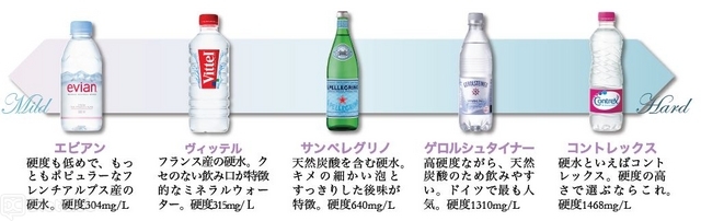 なお、ドラッグストアなどで手に入る硬水としては、「エビアン(硬度304mg/L)」「ヴィッテル(硬度315mg/L)」「サンペレグリノ(硬度640mg/L 天然炭酸含む)」「ゲロルシュタイナー(硬度1310mg/L 天然炭酸水)」「コントレックス(硬度1468mg/L)」などがある。