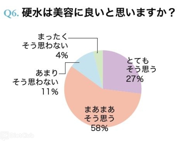また、『硬水は美容に良いと思いますか?』という問いでは、「とてもそう思う(27%)」「まあまあそう思う(58%)」と答えた人の合計が85%となり、美容アイテムとして硬水に良いイメージを持っている人が多いことがわかった。