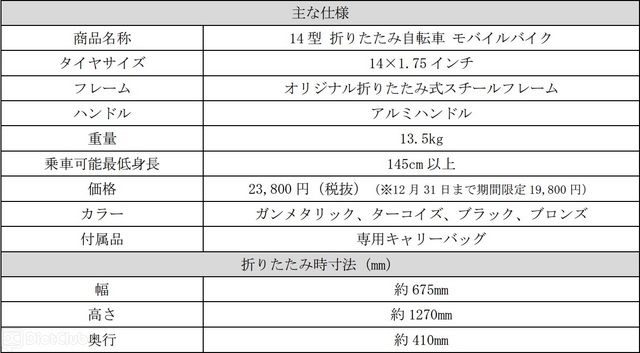 ワンアクションで「折りたたみ」と「組み立て」が可能な折りたたみ自転車を発売…ドン・キホーテ 2014 11/28 fitness 2014年11月28日 商品概要 カラーバリエーション 商品特長 走行性能 ドン・キホーテは、12月1日に『14型 折りたたみ自転車 モバイルバイク』(税抜23,800円)を、全国のドン・キホーテ(一部店舗を除く)で発売開始する。なお、新発売キャンペーンとして、12月31日までは特別価格19,800円(税抜)で販売する。 同商品は、ワンアクションで折りたたみと組み立てが可能で、スムーズに使用できるストレスフリーが特長の折りたたみ自転車。折りたたみ状態では127cmまでコンパクトになり、リアキャリアが折りたたみ時にスタンドとして使用でき、省スペースで保管できる。また、14インチの小径タイヤながら、高いギヤ比の設計により、26型の自転車に劣らない走行性能を実現している。 fitness トレーニング 新商品 自転車 よかったらシェアしてね! URLをコピーしました! 「ホームカット」など、『ケーキドーナツ』4種を期間限定“復刻”…ミスド 結婚式を挙げるカップルは7割…結婚総合意識調査2014(リクルートブライダル総研調べ) この記事を書いた人 浦和 武蔵 関連記事 人生のうちで、運動に費やす時間は何時間? 2016年7月7日 中村アン「ムキムキ系の方がいい。一緒にフィットネスしたい…」 2016年6月17日 中村アン「あと1年半で“乗り越えたい壁”は…」 2016年6月17日 保護者の満足度が高かった「子どものスイミングスクール」を発表! 2016年2月26日 Fitbit、新機能を搭載しファッショナブルな「Fitbit Alta」を発表 2016年2月9日 JA全農とルネサンス、「おにぎりダイエットプログラム」を共同開発 2016年2月2日 ゼロからマラソン大会を目指せる「ランニング上達アプリ」の配信がスタート 2016年1月5日 生島ヒロシ、2か月間のトレーニングで手に入れた「肉体美」を新CMで披露! 2015年10月22日