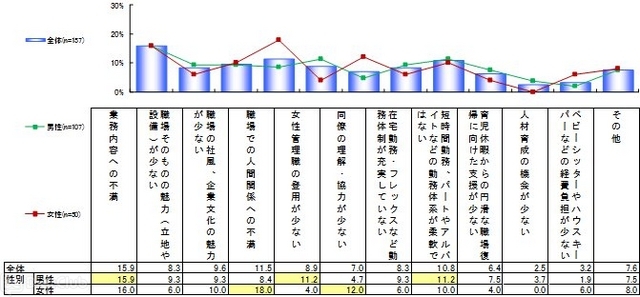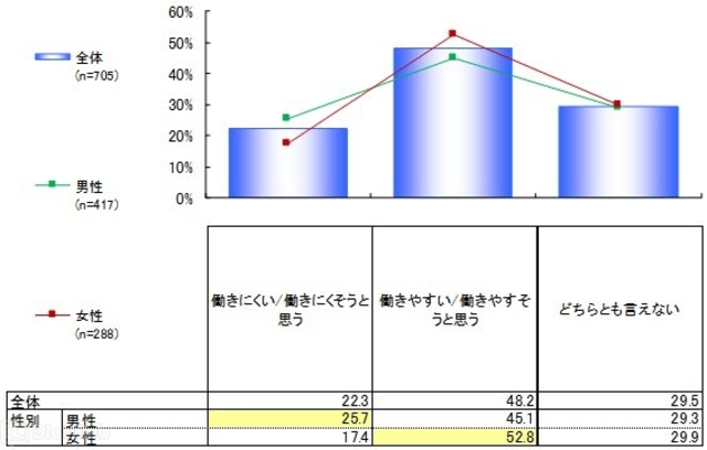 現在勤めている職場が「女性にとって『働きにくい』と思うか」を男女ともに聞いたところ、「働きにくい/働きにくそう」といった回答の割合は22.3%で、約半数(48.2%)が「働きやすい/働きやすそう」と回答した。また、「働きにくい/働きにくそう」と回答した人に、その理由を聞いたところ、「業務内容への不満(15.9%)」が最も多い結果となった。「働きやすい/働きやすそう」と考えている割合の男女差を見ると、女性の方が高く(52.8%)、男性(45.1%)と比較して7.7ポイントの差が出ている。「働きにくい/働きにくそう」と回答した理由は、「職場での人間関係への不満」「同僚の理解・協力が少ない」の項目では男性と比較して女性が多く、一方男性では、「業務内容への不満」「女性管理職の登用が少ない」「短時間勤務、パートやアルバイトなどの勤務体系が柔軟ではない」が多く、男女間に差があることがわかった。