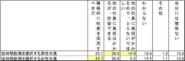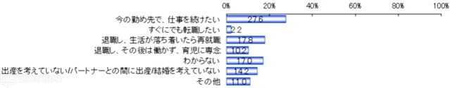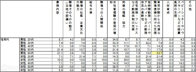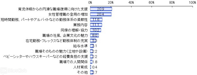 女性が職場で活躍し続けるために最も重要だと思うことを男女ともに聞いたところ、「育児休暇からの円滑な職場復帰に向けた支援(16.1%)」という回答が最も多かった。女性が職場で活躍するために必要なことに関する男女間の差を見ると、女性は「短時間勤務、パートやアルバイトなどの勤務体系の柔軟性(19.4%)」の割合が最も高くなっているが、男性は8.0%と、11.4ポイント低くなっている。一方、「業務内容」の割合は、男性が12.4%と、女性より4.6ポイント高かった。