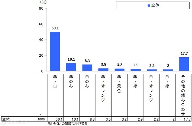 10対義語の回答率を上位5位で見ると、「お正月」は「大晦日」より、「明」「嬉しい」「フォーマル」の印象が強いという結果となった。「お正月」のイメージを表す「色」について聞いたところ、半数が「赤・白(50%)」の組み合わせを選んだ。
