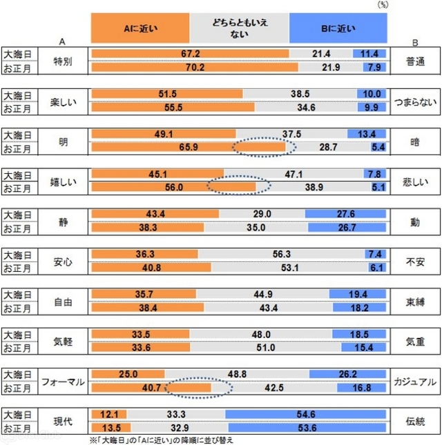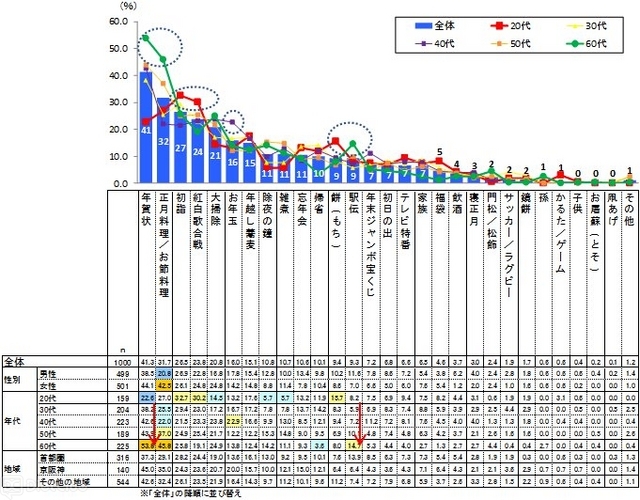「年末年始」と聞くと思い浮かぶ物事は、「年賀状」「お正月料理/お節料理」「初詣」が上位で、年代別で回答率に差が目立つ結果となった。