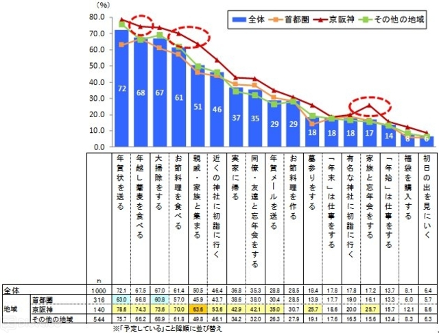 来たる「年末年始」に「予定されている行事」上位3位は、「年賀状を送る」「年越し蕎麦を食べる」「大掃除をする」が7割前後の回答率で、ほかより高くなっている。「年末年始」のほとんどの予定について、「京阪神」の回答率は「首都圏」「その他の地域」より高い傾向が見られた。