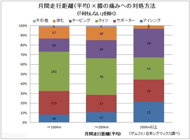 同調査では年齢・性別の他、月間の平均走行距離(練習、大会含む)による分類・比較も行っている。その傾向は月間の平均走行距離が長くなるほど、膝に「痛み・不安」を感じる割合は少なくなり、いわゆる“オーバーユース”との関係性とは単純に結びつかないようだ。また、同調査では、距離が長いランナーほど「テーピング」や「アイシング」などの専門的なケアを実施する割合が高いという傾向が見られた。