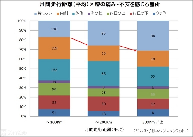 ランナーの約8割が膝に痛みや不安を感じているが、月間走行距離が長いほど不安が少ない傾向に