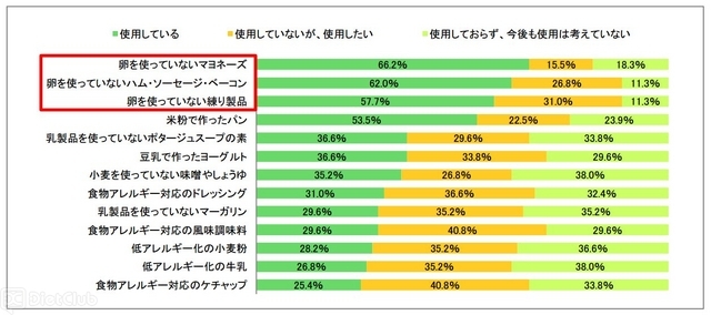給食における代替食品の使用状況を聞いたところ、約7割が給食で代替食品を使用していると回答した。また、使用している代替食品について聞いたところ、卵を使っていない食品が上位を占めた。