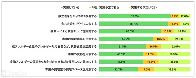 調理から食事提供までの8つの項目について実施状況を聞いたところ、献立表や食札の工夫、複数人による多重チェックなどソフト面での対応は進められているものの、専用の調理器具や食器、調理スペースの確保など、ハード面の対応が遅れていることがわかった。