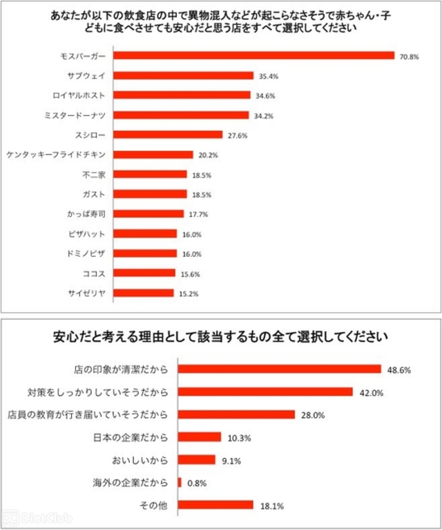 異物混入が起こらなさそうな飲食店を聞いたところ、ほかを大きく引き離す約70%の支持を受けて、モスバーガーが“安心して食べられるお店”に選ばれた。その選定理由としては、「店の印象が清潔」「対策をしていそう」が40%以上となった。2位以下にはサブウェイ、ロイヤルホスト、ミスタードーナツがランクインしている。