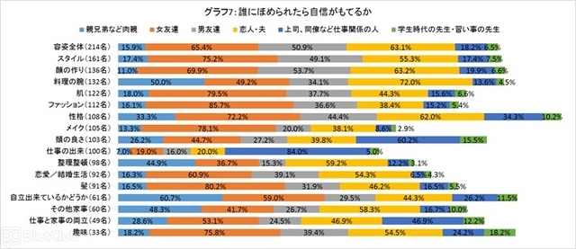 「誰かからほめられたら自信がもてる」と回答した“自分に自信がない女性”に対して、誰にほめられたら自信がもてるかを項目別に聞いたところ、外見や性格でほめられて自信につながるのは「恋人・夫」よりも「女友達」が最も多く、料理の腕や整理整頓など家事まわりは「恋人・夫」が最も多いという結果になった。