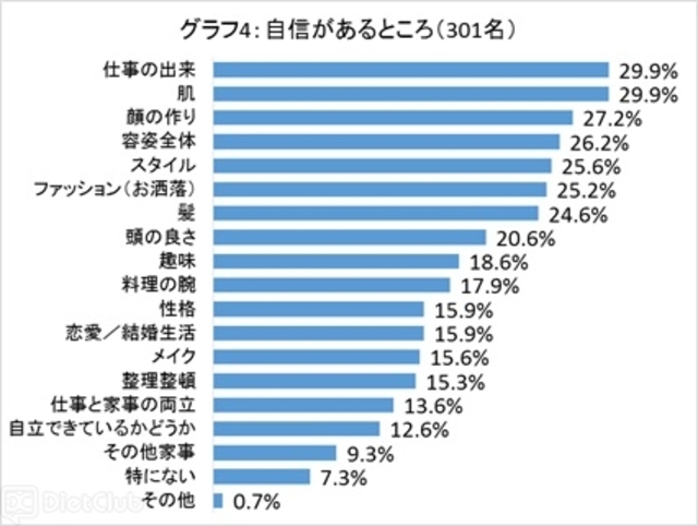 自分に自信がある女性に対し、具体的にどのような部分について自信があるか聞いたところ、具体的に自信があるところは「仕事の出来」や「肌」という回答が多く集まった。その根拠を聞いたところ、「第3者からほめられること」と「自分の努力」であることがわかった。