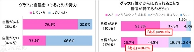 自分自身に対して自信があるかどうかを聞いたところ、約4割の日本女性は自分に自信があり、そのための努力もしていると回答。更に、自分に自信がある女性の9割が「ほめられることで自信がもてる」と回答した。