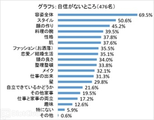 一方、自信がない女性に対し具体的にどのようなところに自信がないか聞いたところ、自信がないのは「容姿」や「スタイル」「顔の作り」など“外見”まわりの回答が多数だった。その理由は、「周りより劣っている」「自分が満足していない」など主観的な見方が多かった一方で、「胸を張って自信があるとは言いづらい」という回答も散見された。